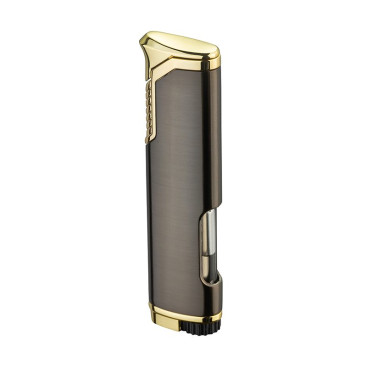 Briquet tempête au style prestigieux, contraste élégant entre finitions sombres et détails dorés.
